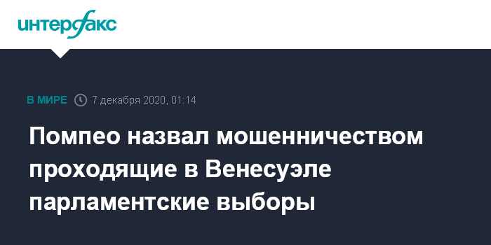 Москва. 7 декабря. INTERFAX.RU - Результаты проводимых властями Венесуэлы парламентских выборов не будут отражать волю народа этой страны, заявил глава госдепа Майк Помпео.