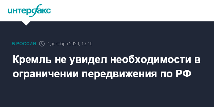 Москва. 7 декабря. INTERFAX.RU - В Кремле считают, что уже принятых мер противодействия распространению коронавируса в России достаточно и их ужесточения, в том числе ограничений в передвижении между регионами, не потребуется.