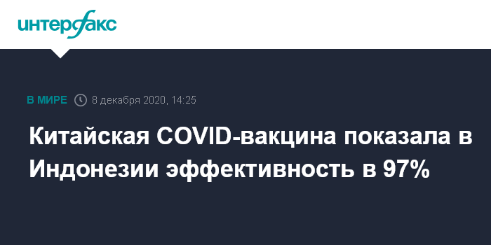 Москва. 8 декабря. INTERFAX.RU - Вакцина китайской компании Sinovac показала до 97% эффективности на испытаниях в Индонезии, сообщает газета South China Morning Post.