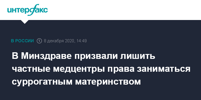 Москва. 8 декабря. INTERFAX.RU - Частные медцентры не должны оказывать услуги суррогатного материнства, заявила директор департамента медицинской помощи детям и службы родовспоможения синистерства здравоохранения РФ Елена Байбарина.