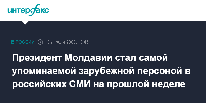 По данным "Системы комплексного анализа новостей" - СКАН, созданной "Интерфаксом", за неделю, с 6 по 12 апреля, многочисленные заявления и действия президента Молдавии в связи с акциями протеста оппозиции в Кишиневе, не признающей итоги прошедших в республике парламентских выборов, упоминались в 1017 материалах различных российских СМИ политической и финансово- экономической направленности.