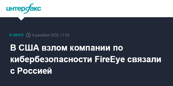 Москва. 9 декабря. INTERFAX.RU - Американская компания FireEye, специализирующаяся на кибербезопасности и защищающая в том числе больше тысячи государственных и правоохранительных органов, подверглась иностранной хакерской атаке. По данным источника Bloomberg, организовавшие взлом хакеры тесно связаны с российскими властями.