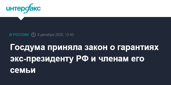 Москва. 9 декабря. INTERFAX.RU - Госдума в среду приняла в третьем, окончательном, чтении закон о гарантиях экс-президенту РФ и членам его семьи во исполнение обновленной Конституции.