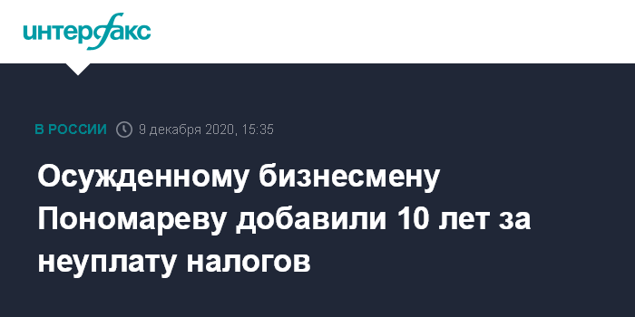 В ведомстве отметили, что Пономарев признан виновным в уклонении от уплаты налогов на сумму более 9,7 млрд рублей и покушении на мошенничество в сумме более 5,4 млрд рублей (часть 2 статьи 199 УК РФ, часть 2 статьи 198 УК РФ, часть 3 статьи 30, часть 4 статьи 159 УК РФ).