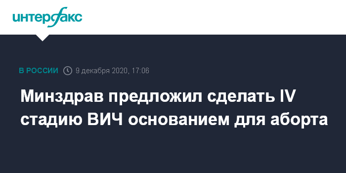 Москва. 9 декабря. INTERFAX.RU - Минздрав РФ предложил включить четвертую стадию развития ВИЧ-инфекции в перечень оснований для аборта - соответствующий проект приказа опубликован на портале проектов нормативных правовых актов.
