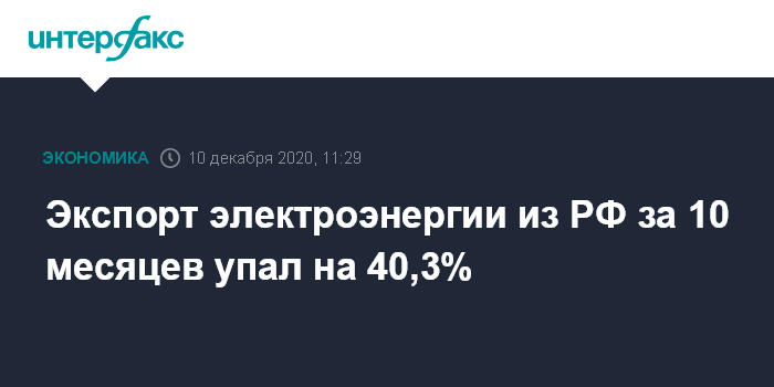 Экспорт электроэнергии из РФ за 10 месяцев упал на 40,3%