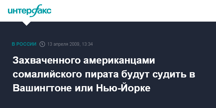 Москва. 13 апреля. INTERFAX.RU - Министерство юстиции США рассматривает вопрос о месте проведения суда над одним из сомалийских пиратов, сдавшимся американским военным в плен.