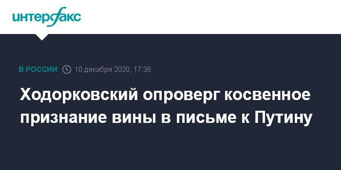 Москва. 10 декабря. INTERFAX.RU - Бизнесмен Михаил Ходорковский в ответ на слова президента Владимира Путина о косвенном признании вины в прошении о помиловании в 2013 году заявил, что никогда этого не делал.