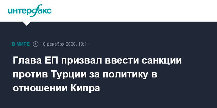 "Европейский парламент голосовал за резолюцию, призвавшую гарантировать целостность острова Кипр. И если не получается обеспечить гарантии целостности территории государства-члена ЕС, необходимо принять санкции против Турции, раз она не намерена отказываться от своих агрессивных действий", - сказал глава Европарламента после выступления в четверг в Брюсселе перед лидерами стран ЕС.