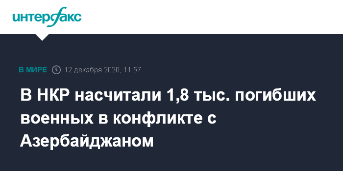 Москва. 12 декабря. INTERFAX.RU - Министерство обороны непризнанной Нагорно-Карабахской республики (НКР) сообщило о еще 36 погибших военнослужащих в боях с азербайджанскими подразделениями в зоне карабахского конфликта.