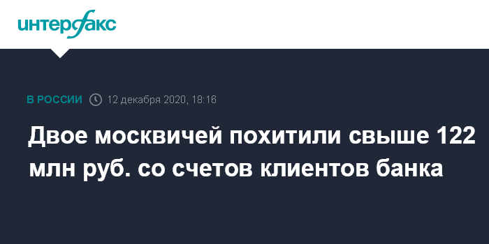 Москва. 12 декабря. INTERFAX.RU - Сотрудники правоохранительных органов задержали двоих подозреваемых в хищении более 122 млн рублей со счетов клиентов банка в разных регионах РФ, сообщила официальный представитель МВД России Ирина Волк.