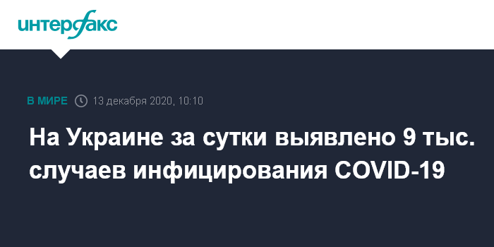 Москва. 13 декабря. INTERFAX.RU - На Украине по состоянию на утро 13 декабря зафиксировано 9 176 новых случаев заболевания коронавирусом, умерли 156 пациентов, сообщается на сайте Системы мониторинга распространения эпидемии коронавируса Совета национальной безопасности и обороны (СНБО) Украины.