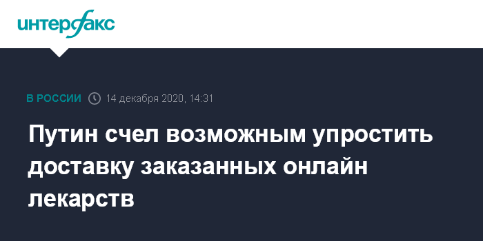 Москва. 14 декабря. INTERFAX.RU - Президент РФ Владимир Путин допустил возможность либерализации требований к аптечным сетям для доставки лекарств, заказанных онлайн.