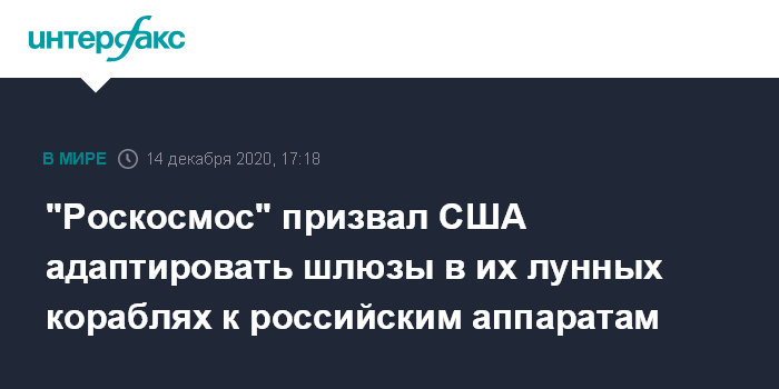 Москва. 14 декабря. INTERFAX.RU - "Роскосмос" предлагает американскому НАСА адаптировать шлюзы на американских "лунных кораблях" для возможной стыковки с российскими аппаратами в случае чрезвычайных ситуаций, сообщил глава госкорпорации Дмитрий Рогозин.