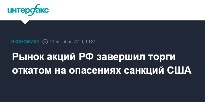 Москва. 14 декабря. INTERFAX.RU - Рынок акций РФ, активно поднимавшийся большую часть торгов в понедельник на фоне общемирового оптимизма в отношении внедрения вакцин от COVID-19, вечером развернулся вниз. Это произошло после появления игроков из США, начавших распродавать российские бумаги на опасениях антироссийских санкций США из-за якобы хакерских атак на ведомства США. Индекс МосБиржи после обновления исторического максимума выше 3314 пунктов откатился к закрытию сессии в район 3250 пунктов, при этом выросли бумаги металлургов.