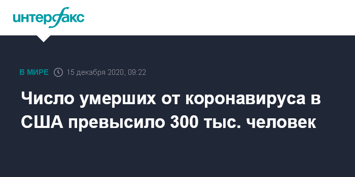 Москва. 15 декабря. INTERFAX.RU - В Соединенных Штатах с начала пандемии COVID-19 от связанных с коронавирусом заболеваний умерли 300 586 человек, сообщил в ночь на вторник американский университет Джонса Хопкинса.