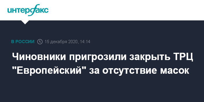 Москва. 15 декабря. INTERFAX.RU - В Москве торгово-развлекательный центр "Европейский" в Москве могут оштрафовать или закрыть на срок до 90 суток за нарушения требований по профилактике коронавирусной инфекции, сообщил замначальника объединения административно-технических инспекций (ОАТИ) столицы Станислав Зинюшин.