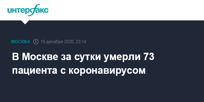 Москва. 15 декабря. INTERFAX.RU - Еще 73 пациента с пневмонией и положительными тестами на коронавирус COVID-19 скончались в Москве за сутки, сообщил столичный оперштаб по контролю за коронавирусом во вторник.