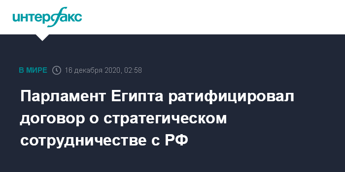 Москва. 16 декабря. INTERFAX.RU - Палата депутатов Египта ратифицировала договор о всестороннем партнерстве и стратегическом сотрудничестве с РФ, сообщают местные СМИ.