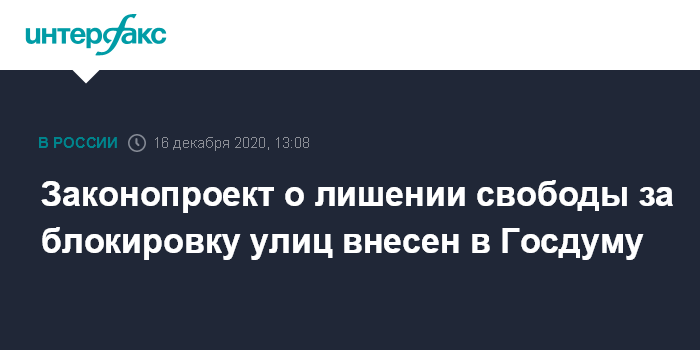 Москва. 16 декабря. INTERFAX.RU - Депутат Дмитрий Вяткин внес в Госдуму законопроект, который вводит наказание в виде года лишения свободы за блокировку движения транспорта на дорогах, трассах и улицах городов.