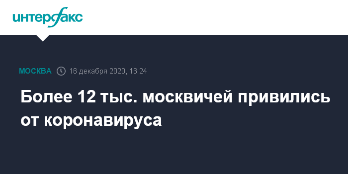 Москва. 16 декабря. INTERFAX.RU - К настоящему времени свыше 12 тыс. жителей Москвы прошли вакцинацию от коронавируса, сообщил столичный оперштаб по контролю за COVID-19 в среду в своем телеграм-канале.