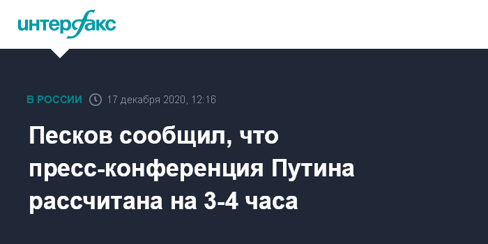 Песков сообщил, что пресс-конференция Путина рассчитана на 3-4 часа