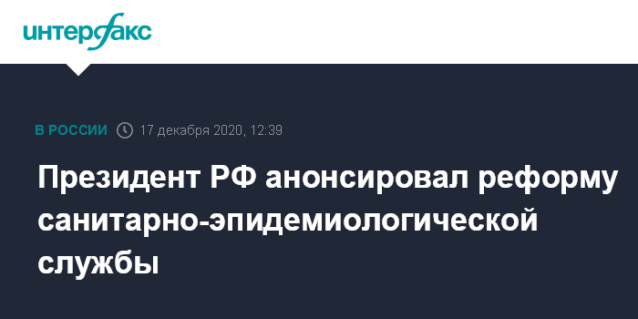 Москва. 17 декабря. INTERFAX.RU - Президент РФ Владимир Путин заявил о необходимости реформирования санитарно-эпидемиологической службы страны.