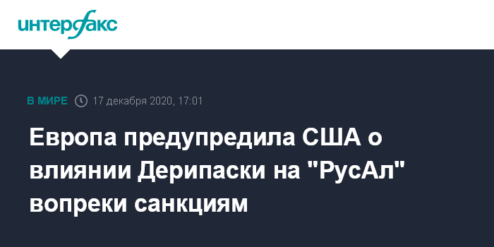 Москва. 17 декабря. INTERFAX.RU - Европейские чиновники направили американскому правительству информацию о том, что Олег Дерипаска, по их данным, продолжает вопреки санкциям принимать непосредственное участие в управлении "РусАлом" и влиять на его менеджмент. Об этом сообщило агентство Bloomberg со ссылкой на источники.