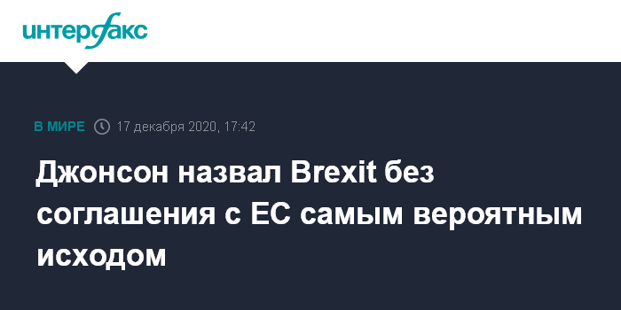 Москва. 17 декабря. INTERFAX.RU - Премьер-министр Великобритании Борис Джонсон заявил, что Brexit без соглашения о будущих отношениях с Евросоюзом остается самым вероятным завершением переходного периода, сообщают европейские СМИ.