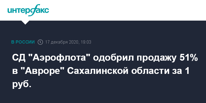 Москва. 17 декабря. INTERFAX.RU - Совет директоров "Аэрофлота" на заседании в четверг одобрил продажу 51% акций в дальневосточной авиакомпании "Аврора" в пользу принадлежащего региону АО "Корпорация развития Сахалинской области".