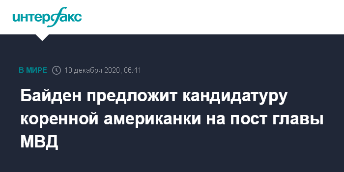Москва. 18 декабря. INTERFAX.RU - Избранный президент Джо Байден выдвинет кандидатуру Деб Хааланд на пост главы министерства внутренних дел США, сообщила The Washington Post.