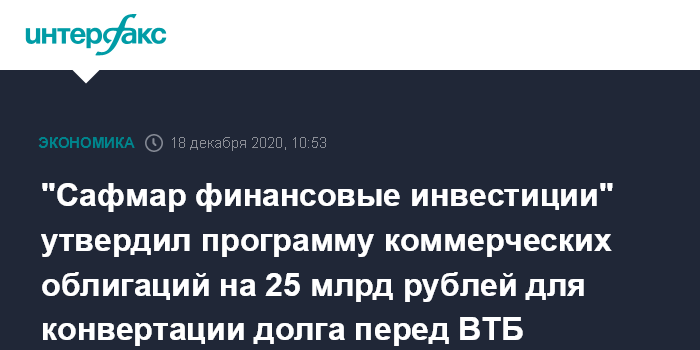 Москва. 18 декабря. INTERFAX.RU - Совет директоров ПАО "Сафмар финансовые инвестиции" сообщил, что утвердил программу коммерческих облигаций для конвертации долга перед ВТБ для финансирования buyback.