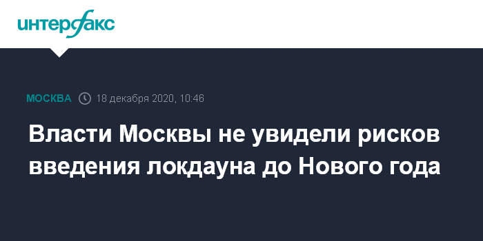 Москва. 18 декабря. INTERFAX.RU - Столичные власти не видят предпосылок для введения локдауна в Москве до новогодних праздников, дальше решения будут приниматься исходя из ситуации.