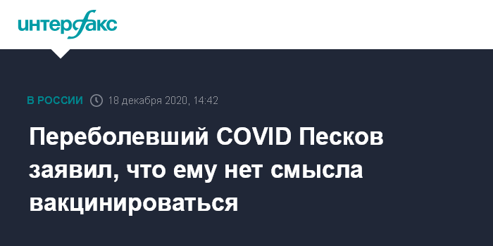 Переболевший COVID Песков заявил, что ему нет смысла вакцинироваться