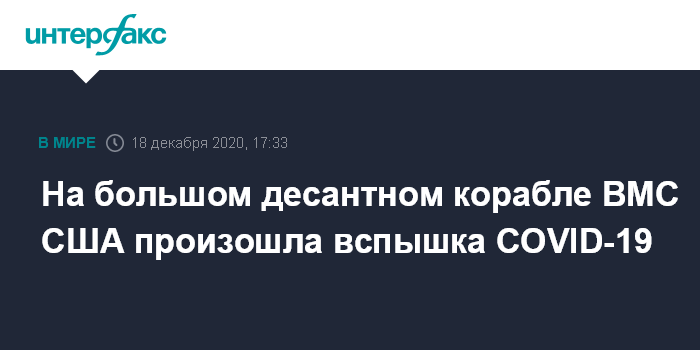 Москва. 18 декабря. INTERFAX.RU - Несколько десятков членов экипажа американского универсального десантного корабля USS Essex заболели коронавирусом во время его похода. Об этом сообщило командование надводных сил Тихоокеанского флота ВМС США.