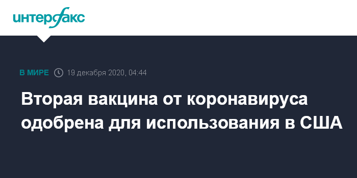 Москва. 19 декабря. INTERFAX.RU - Управление по санитарному надзору за качеством пищевых продуктов и медикаментов (FDA) США в пятницу выдало экстренное разрешение на использование в стране вакцины от коронавируса, разработанной американской фармацевтической компанией Moderna, сообщается на сайте регулятора.