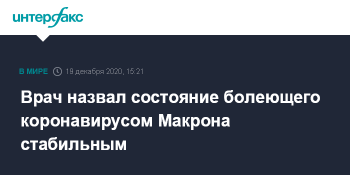 Москва. 19 декабря. INTERFAX.RU - Президент Франции Эммануэль Макрон, заболевший COVID-19, продолжает удаленно выполнять свою работу, его состояние - стабильное, сообщил в субботу главврач Елисейского дворца Жан-Кристоф Перрошон.