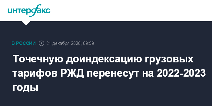 Москва. 21 декабря. INTERFAX.RU - Дополнительная точечная индексация грузовых тарифов РЖД, которую правительство заблокировало в 2021 году, может пройти в 2022-2023 годах. Как пишет "Коммерсантъ", об этом говорится в последней редакции документов к финальному обсуждению 24 декабря финансового плана РЖД на три года.