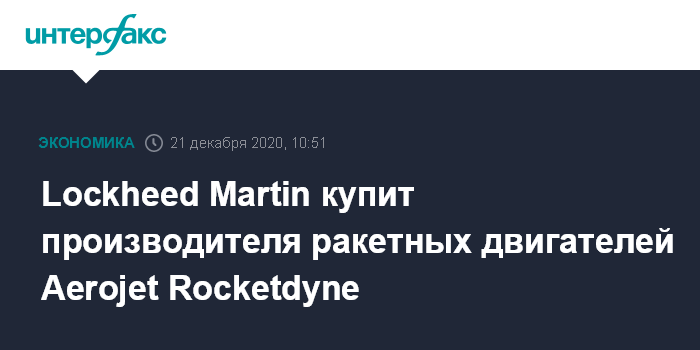 "Приобретение Aerojet Rocketdyne позволит сохранить и укрепить одну из важных составляющих оборонно-промышленной базы и сократить расходы для наших клиентов и американских налогоплательщиков", - сказал президент и главный исполнительный директор Lockheed Джеймс Тейклет, слова которого приводятся в сообщении компании.