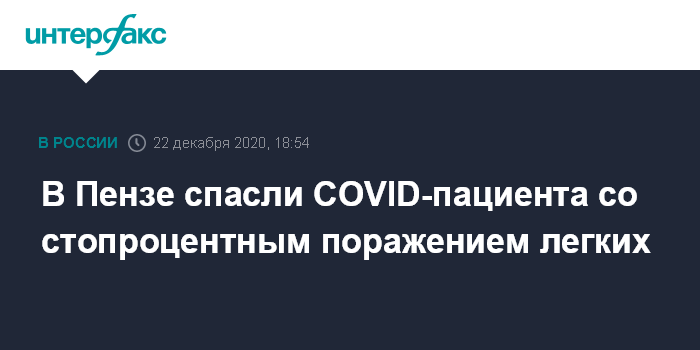 Москва. 22 декабря. INTERFAX.RU - Врачи Пензенского областного клинического центра специализированных видов медицинской помощи полтора месяца боролись за жизнь пациента со стопроцентным поражением легких на фоне коронавирусной инфекции, мужчину удалось спасти, сообщается на сайте Минздрава региона.