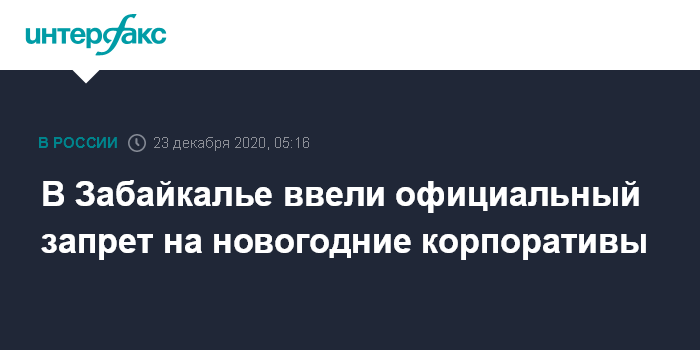 Москва. 23 декабря. INTERFAX.RU - Дополнительные ограничения введены на период новогодних праздников в Забайкалье, они коснутся массовых мероприятий в трудовых коллективах, сообщает в среду пресс-служба правительства края.