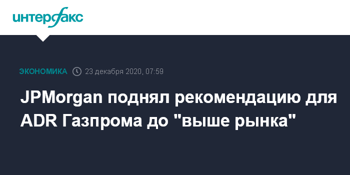 Москва. 23 декабря. INTERFAX.RU - JPMorgan повысил рекомендацию для американских депозитарных расписок (ADR) "Газпрома" с "нейтрально" до "выше рынка", сообщило агентство Bloomberg.
