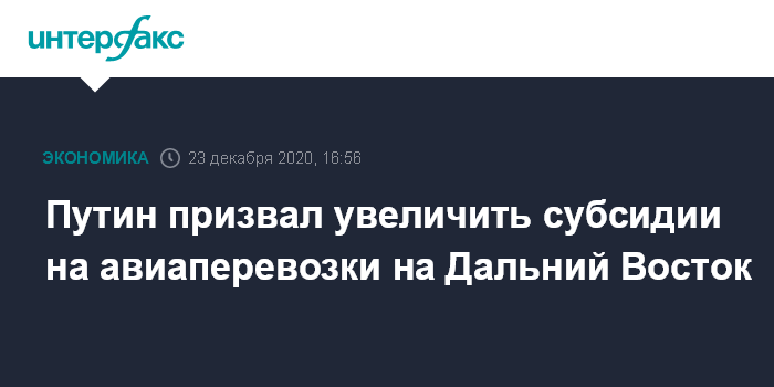 Москва. 23 декабря. INTERFAX.RU - Президент Владимир Путин призвал увеличить субсидии на пассажирские авиаперевозки из европейской части России на Дальний Восток. На заседании Госсовета и Совета по стратегическому развитию и национальным проектам он высказал мнение, что пока на это выделяется слишком мало денег.