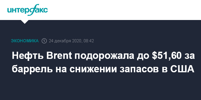 Москва. 24 декабря. INTERFAX.RU - Цены на нефть растут в ходе торгов в четверг на фоне публикации данных об уменьшении запасов в США, которые укрепили надежды инвесторов на восстановление спроса, а также сообщений о потенциальном торговом соглашении между Великобританией и Европейским союзом.