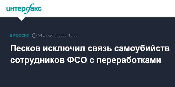 Москва. 24 декабря. INTERFAX.RU - Пресс-секретарь президента Дмитрий Песков заявил, что недавние случаи самоубийств сотрудников ФСО не связаны с перегрузками на работе. Его спросили о причинах недавних суицидов двух сотрудников спецслужбы.