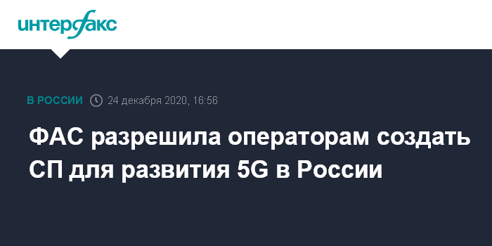Москва. 24 декабря. INTERFAX.RU - Федеральная антимонопольная служба (ФАС) РФ удовлетворила ходатайство телеком-операторов по созданию совместного предприятия для развития 5G в России, сообщил регулятор.