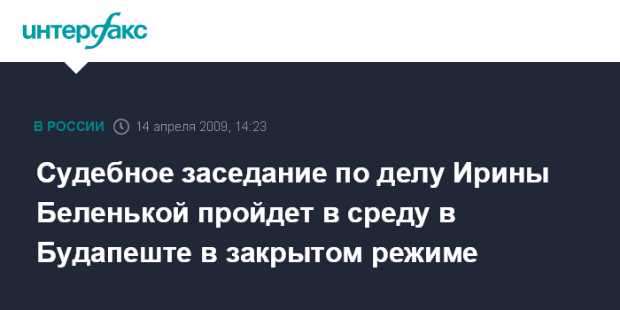 Москва. 14 апреля. INTERFAX.RU - Судебное заседание по делу россиянки Ирины Беленькой состоится 15 апреля в Будапеште, сообщила пресс-секретарь посольства РФ в Венгрии Ирина Звонова.