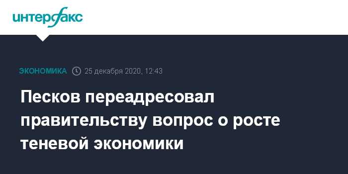 Москва. 25 декабря. INTERFAX.RU - Пресс-секретарь президента РФ Дмитрий Песков переадресовал в правительство вопрос, фиксируют ли российские власти рост теневой экономики в стране и видят ли в этом опасность.
