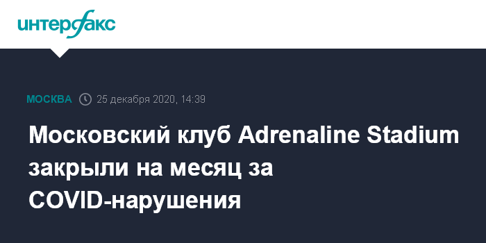 Москва. 25 декабря. INTERFAX.RU - Савеловский суд Москвы в пятницу постановил приостановить работу клуба Adrenaline Stadium на 30 суток за невыполнение мер по профилактике коронавируса, сообщается на сайте городского управления Роспотребнадзора.