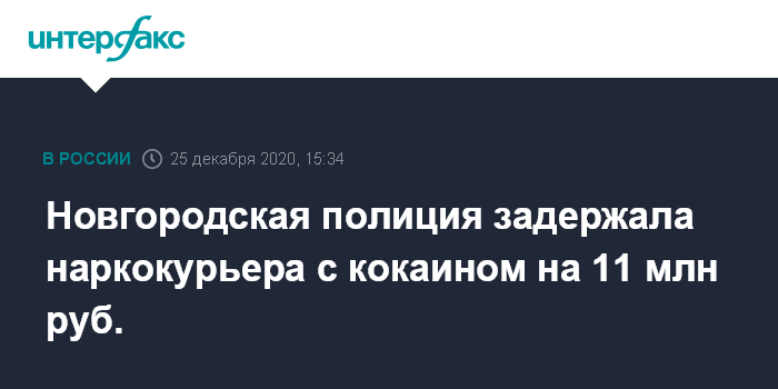 Москва. 25 декабря. INTERFAX.RU - Новгородская полиция задержала наркокурьера с 1 кг кокаина стоимостью около 11 млн рублей, сообщает пресс-служба регионального УМВД.